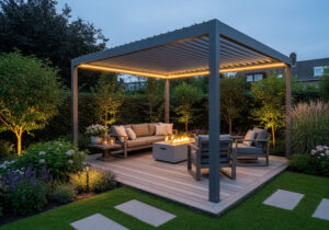 • Aranżacja świetlna LED – zastosowanie oświetlenia LED w dachu i słupach pergoli.