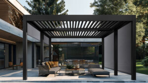 Pergola zintegrowana z roletą tekstylną screen od jednego producenta.